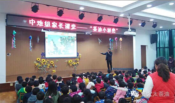 在一小段《健康生活大調(diào)查》如何選擇食用油的VCR播出后,“茶油小秘密”正式拉開帷幕。在聶總的帶領(lǐng)下,小朋友和老師們隨著PPT的節(jié)奏和音樂聲,一起跨過四季,翻山越嶺,走進(jìn)油茶林,“賞”茶花,“摘”茶果,認(rèn)識(shí)了油茶樹“十月懷胎”和花果同期的神奇。