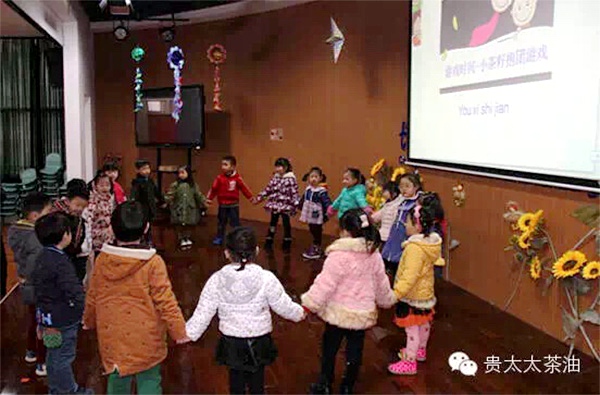 之后,還有一個(gè)《茶油蹲》的小游戲,“茶花蹲,茶花蹲,茶花蹲完茶果蹲……”。課堂的現(xiàn)場氣氛爆棚,還有小朋友因沒有選上臺(tái)參加游戲流下了遺憾的眼淚。